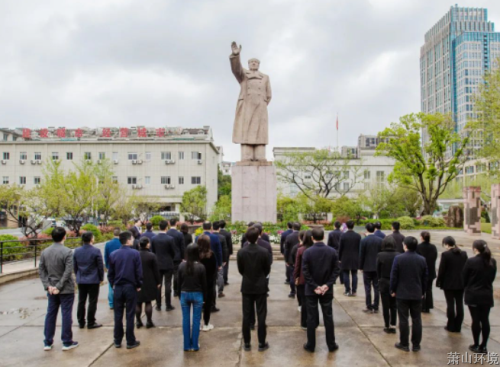 在毛主席紀念像前,全體職員靜默肅立、三鞠躬表達對偉人首腦毛主席的高尚敬意和深切吊祭,瞻仰偉人英容,追憶偉人事跡,重溫入黨誓詞。