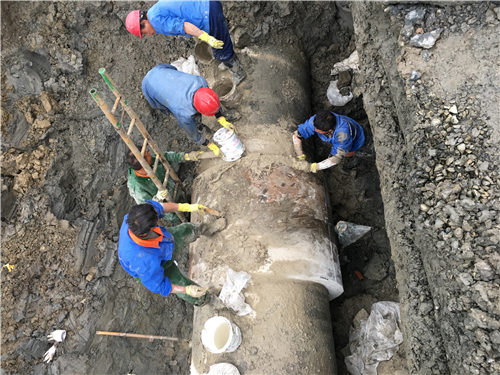 勘探時(shí)代,事情職員發(fā)明管道漏水位置周圍有燃?xì)夤艿篮碗娏?,連忙聯(lián)系電力公司與燃?xì)夤静⒋_定位置,確保搶修對燃?xì)夤芎碗娏軣o影響。搶修中,因管道破損位置受電力管阻擋,挖機(jī)很難作業(yè),只強(qiáng)人工開挖,加上雨天影響,大大增添了搶修難度。近三更時(shí)分,破損位置被找出,管道爆開70厘米長的裂痕。由于該管道是高能管,替換需配備相同管道?K劑康角佬奘奔浣羝?,南片運(yùn)管中心最終接納外衣DN1400鋼管,并在其中填充速干水泥,最后混凝土方包的計(jì)劃施工。