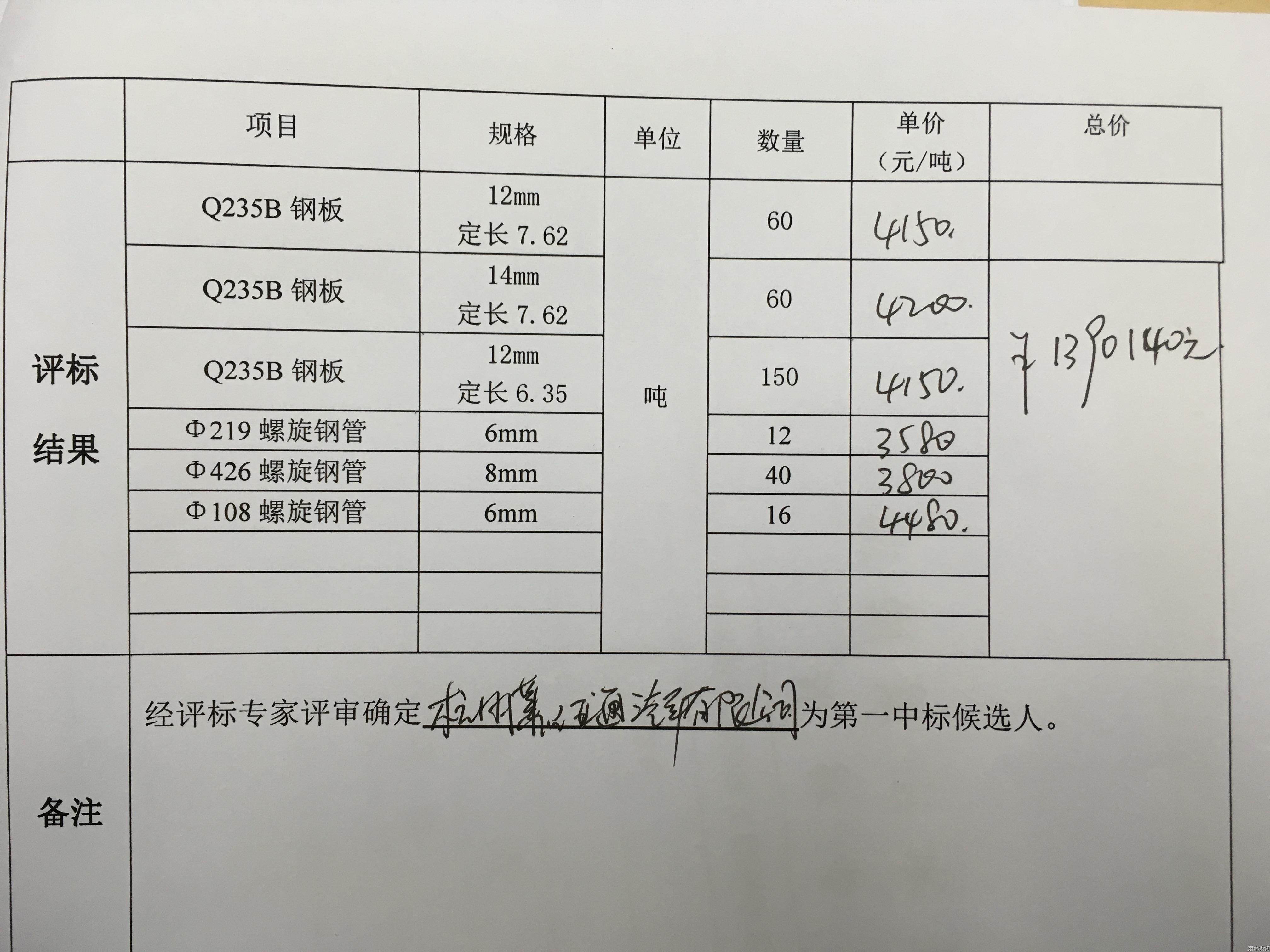 通告內(nèi)容: 憑證集團(tuán)工程項(xiàng)目招標(biāo)有關(guān)劃定,于2016年12月20日09:00時(shí),在水務(wù)集團(tuán)B座 27樓聚會(huì)室,組織了杭州新城德佳房地產(chǎn)開發(fā)有限公司給水工程等鋼板、鋼管采購(gòu)項(xiàng)目招標(biāo)的開標(biāo)運(yùn)動(dòng),憑證招標(biāo)文件中約定的總價(jià)最低價(jià)中標(biāo)原則,確定中標(biāo)候選人,中標(biāo)單價(jià)及總價(jià)由中標(biāo)單位自行填報(bào),F(xiàn)將招標(biāo)效果公示如下: 一、 中標(biāo)效果公示: 中標(biāo)單位:杭州蕭山亞通汽車有限公司 評(píng)標(biāo)專家:何英菲、黃李棟、李永剛 二、投訴電話:0571-82828930 |