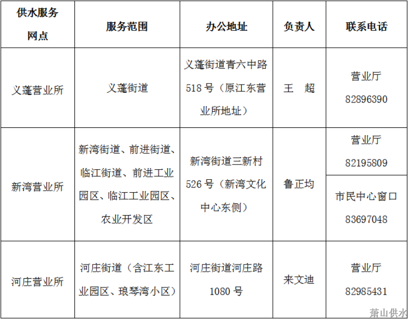 錢塘新區(qū)供水服務(wù)新調(diào)解由義蓬、新灣、河莊三個(gè)營(yíng)業(yè)所管理,作廢原江東營(yíng)業(yè)所,詳見(jiàn)下表: