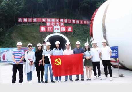 隨后,第三黨小組一行到滕村工業(yè)廣場觀摩已組裝成型、正在調(diào)試中的雙護盾TBM“錢南號”,“錢南號”直徑6.0米,機長約500米,重1100噸,為華東地區(qū)首臺TBM裝備,是集掘進、支護、出渣、運輸?shù)仁┕すば蚱叫幸贿B作業(yè),是一種工廠化流水線隧道施工裝備,具有掘進速率快、利于環(huán)保、綜合效益高等優(yōu)點,可實現(xiàn)古板鉆爆法難以實現(xiàn)的重大地理地貌深埋長隧洞的施工。今天,來訪的黨員同志們在施工現(xiàn)場近距離接觸這個“大塊頭”,并照相留影,紛紛感傷此次黨建運動坦蕩眼界,收獲頗豐。