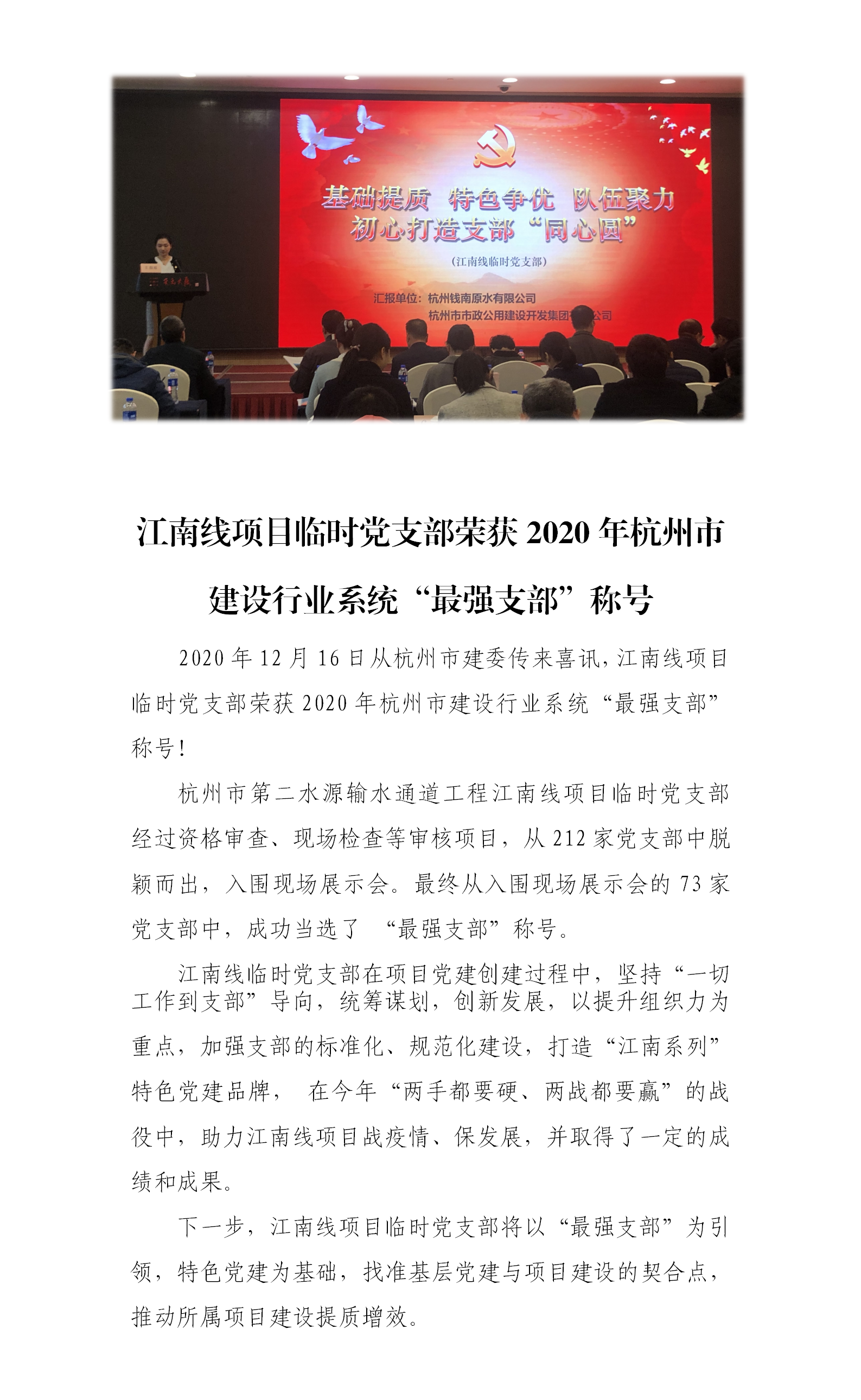 江南線項目暫時黨支部榮獲2020年杭州市建設(shè)行業(yè)系統(tǒng)“最強支部”稱呼