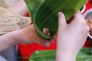 一片寬大的粽葉,彎曲折成圓錐狀,隨后將糯米和配料包入其中,封口后用繩子扎緊綁好,一個(gè)個(gè)碧綠飽滿的粽子就完成了。各人一起包粽子、做香囊、掛艾草,近距離感受端午節(jié)古板習(xí)俗,體驗(yàn)指尖上的濃情端午,配合追憶屈原,熏陶愛國(guó)情懷。