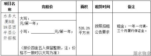 1、憑證貴方水務(wù)大廈B座18層西半層果真招租項目的通告, 遵照有關(guān)劃定,我方愿以以下報價肩負(fù)招租要求。