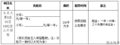 1、憑證貴方水務(wù)大廈B座16層1602室果真招租項目的通告, 遵照有關(guān)劃定,我方愿以以下報價肩負(fù)招租要求。